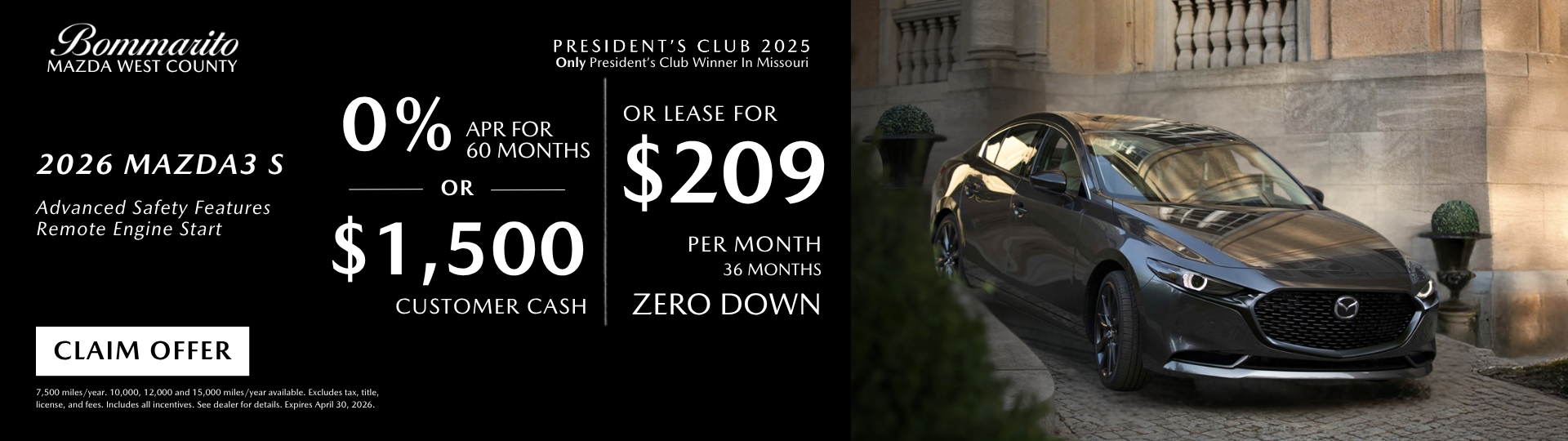 2026 Mazda3 S 0% APR OR $1500 Customer Cash OR Lease $209 Per Month
